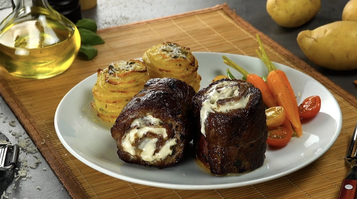 Dieses Gericht sieht auf den ersten Blick gewöhnlich aus, schmeckt aber außergewöhnlich lecker. Denn in Rindersteak eingerollter roher Schinken und Cheddar sehen beim Aufschneiden nicht nur zum Anbeißen aus, sondern schmecken auch noch gut. Ein ganz besonderer Blickfang auf dem Teller sind zudem die getürmten Kartoffeln.