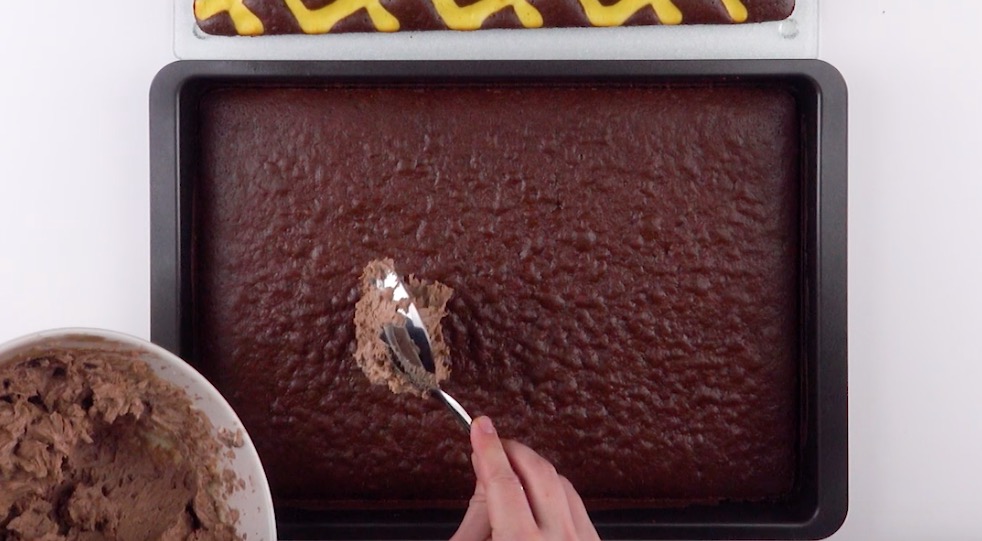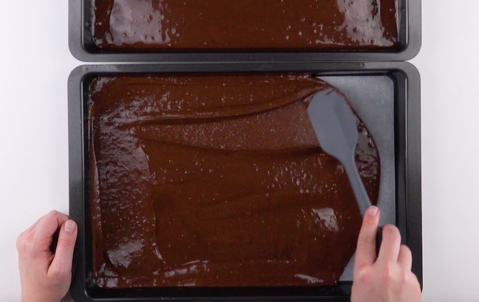 Arbeite anschließend Mehl, Kakaopulver und Backpulver mit einem Teiglöffel ein. Verteile den Teig nun zu gleichen Teilen auf zwei mit Backpapier ausgelegte tiefe Backbleche und streiche die Oberflächen glatt.