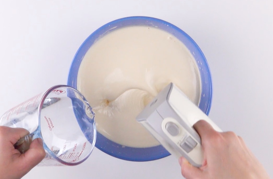 So geht es: 1.) Widme dich zuerst dem Teig und schlage mit einem Handrührgerät die Eier mit dem Zucker in einer großen Schüssel cremig. Gieße dann nach und nach Wasser und Öl dazu und schlage die Creme weiter, bis sie eine gleichmäßige, flüssige Konsistenz hat.