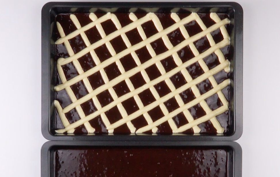 2.) Im nächsten Schritt schlägst du Quark, Ei, Puderzucker und Vanillepuddingpulver mit einem Handrührgerät auf. Fülle die Creme in einen Spritzbeutel mit breiter Tülle und trage auf einem der zwei Teige ein Rautenmuster wie auf dem folgenden Bild auf: