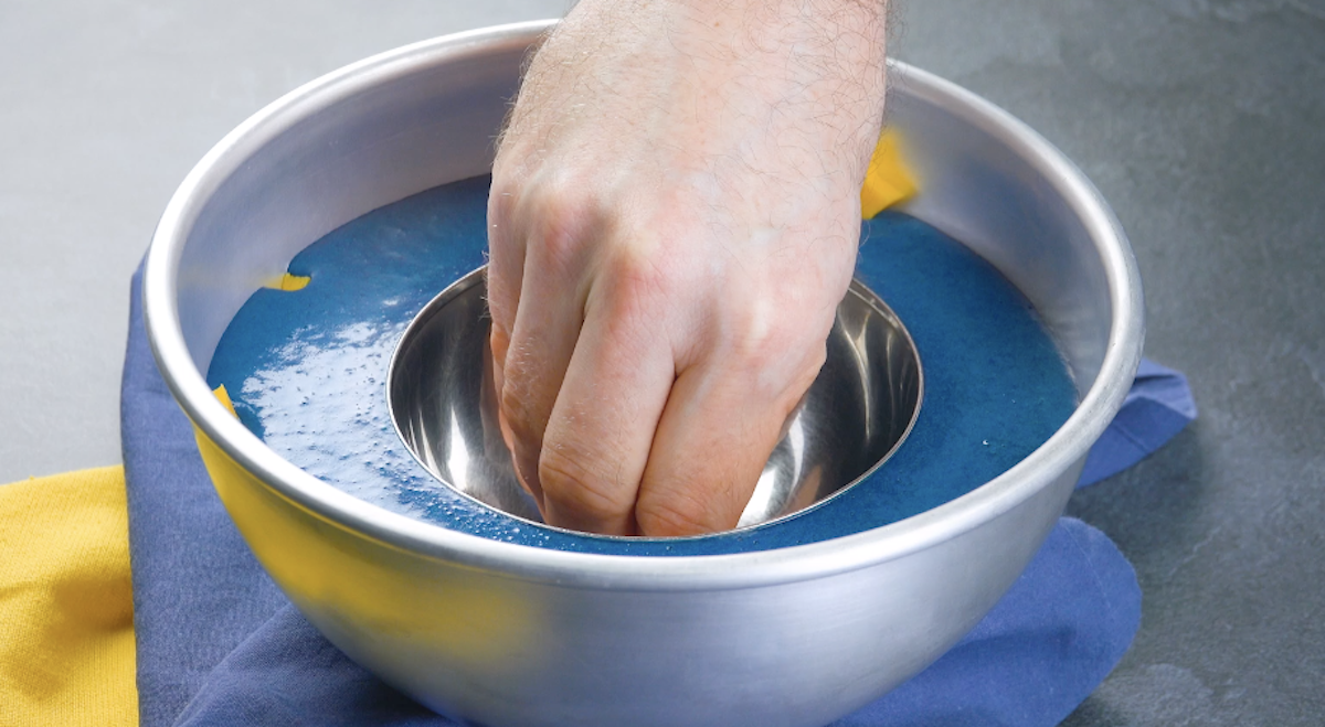 5. Gieße nun den blauen Pudding bis zur Hälfte in die Form. (Sollte der Pudding zu fest geworden sein, kannst du ihn kurz in der Mikrowelle erwärmen, dann wird er wieder flüssig.) Drücke nun die kleine Metallschüssel in die Mitte und stelle diese „Konstruktion“ in den Kühlschrank, bis sie fest geworden ist.
