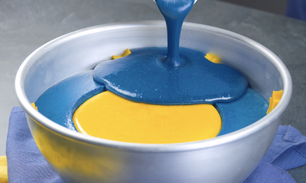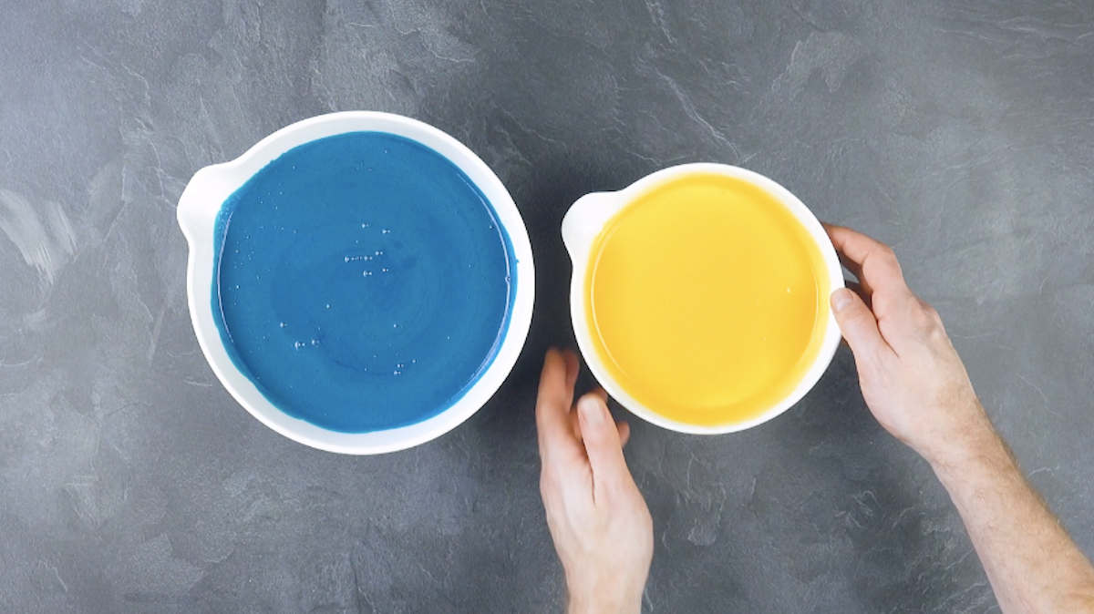 2. Teile die Masse und färbe 1/3 mit gelber und 2/3 mit blauer Lebensmittelfarbe ein.