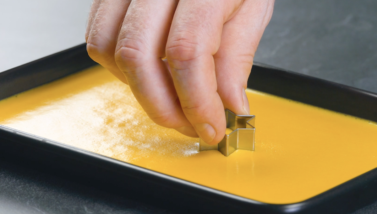 3. Fette ein kleines Backblech ein, gieße etwas gelben Pudding darauf und lass ihn fest werden. Stich aus dem fest gewordenen Pudding Sterne in zwei Größen aus.