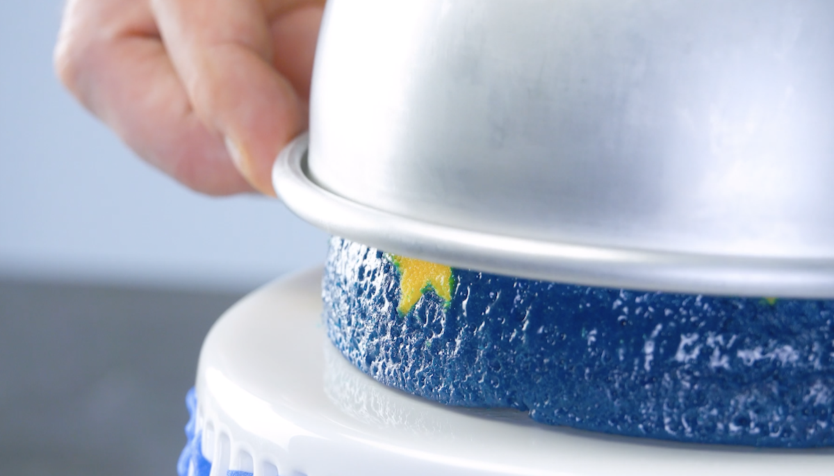 6. Entferne dann die kleine Schüssel und fülle gelben Pudding in die Kuhle. Zum Festwerden stellst du alles erneut in den Kühlschrank. Zum Schluss gibst du den restlichen blauen Pudding in die Schüssel und kühlst alles für mindestens 4 Stunden.