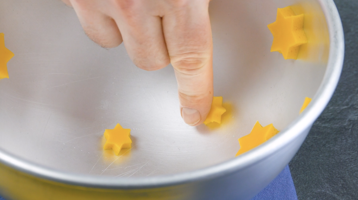 4. Spüle die größere der beiden Metallschalen mit kaltem Wasser aus und drücke die ausgestochenen Sterne an deren Innenwand.
