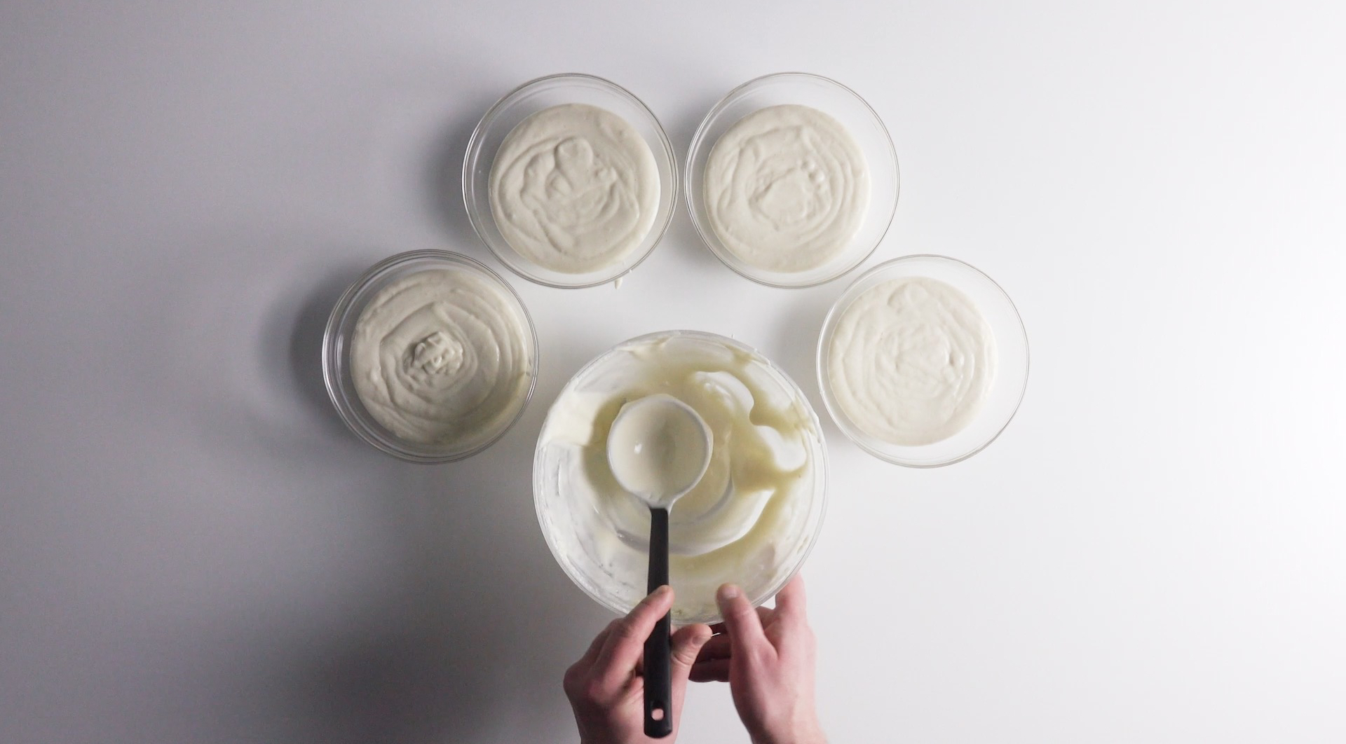 1.) Schlage zuerst mit einem Handrührgerät das Eiweiß mit dem Zucker schaumig. Rühre dann die Milch ein und im weiteren Verlauf nach und nach die trockenen Zutaten. Zum Schluss kommen die Vanille und das flüssige Kokosöl dazu. Teile den Teig anschließend zu gleichen Teilen auf 4 Schüsseln auf.