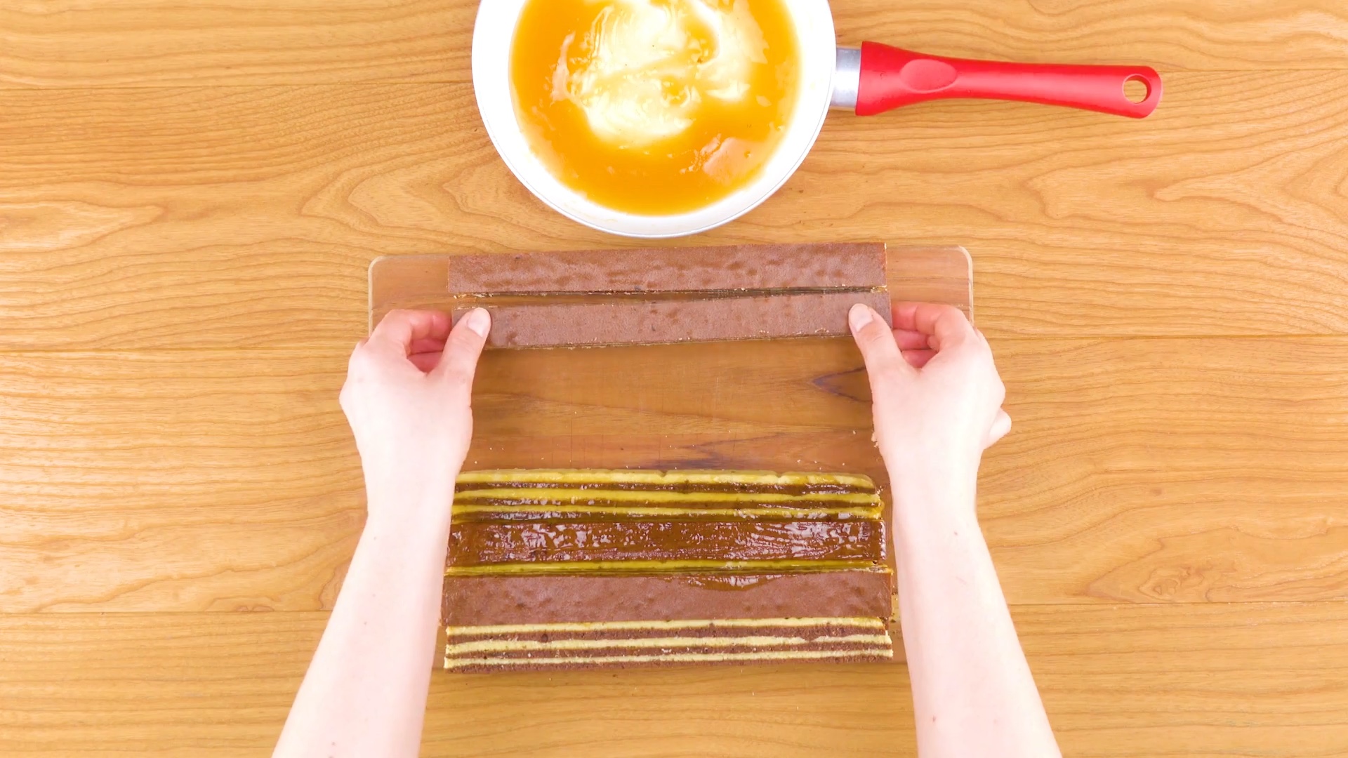 6.) Erwärme das Aprikosengelee, um es zu verflüssigen, und streiche damit großzügig die Streifen ein. Setze nun je vier Streifen in zwei Reihen übereinander zu einem Kastenkuchen zusammen. Streiche alle Seiten, die sich berühren, gut mit Gelee ein. So kleben sie zusammen und bleiben in Form.