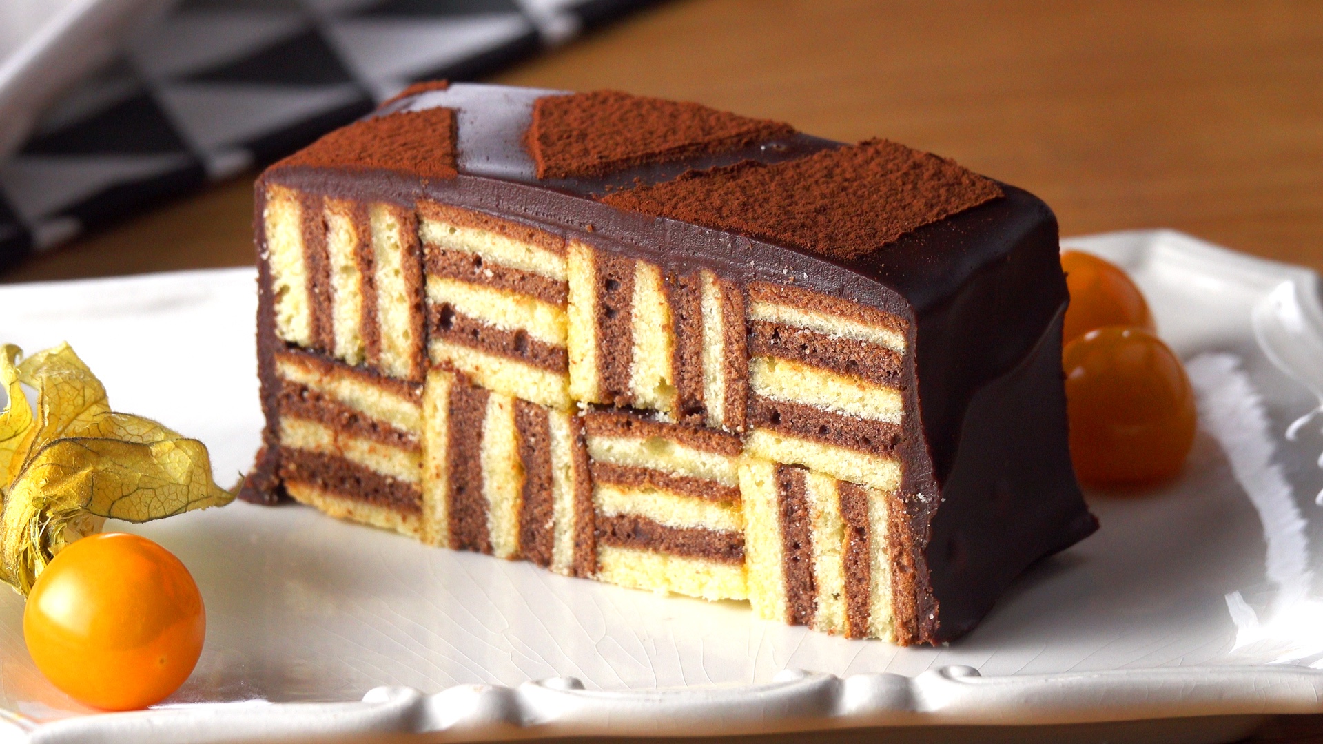 7.) Um die Kuchen-Ganache zuzubereiten, koche Schlagsahne auf, nimm sie von der Kochstelle und füge dann die zerkleinerte Kuvertüre hinzu. Löse die Schokolade unter Rühren auf und füge erst zum Schluss die Butter hinzu. Setze den Streifenkuchen nun auf ein Kuchengitter und lass die Ganache auf ihn laufen. Achte darauf, den Kuchen vollständig einzudecken, und streiche die Ganache bei Bedarf mit einem Teigschaber glatt.