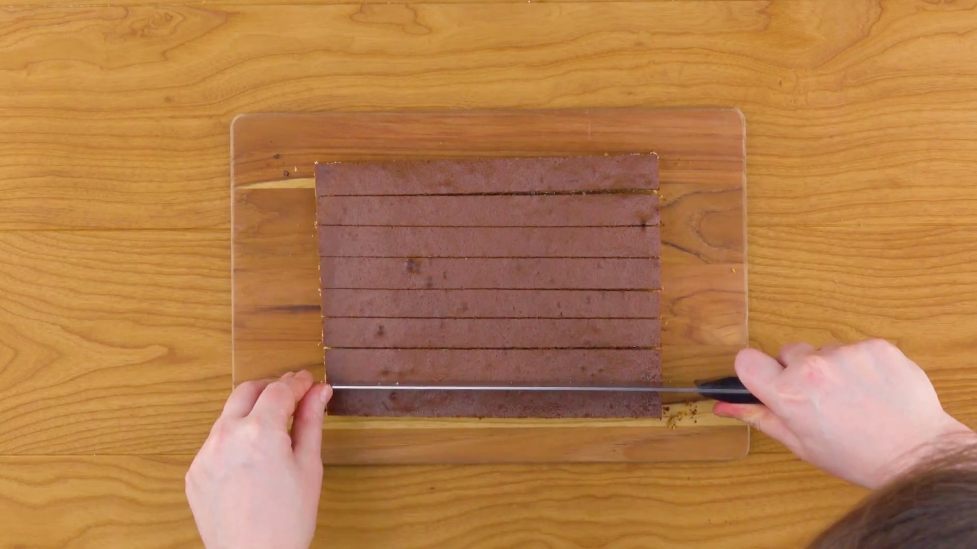 5.) Den fertig gebackenen Kuchen schneidest du in eine rechteckige Form. Achte darauf, alle Kanten genau gerade abzuschneiden. Für die nächsten Schritte ist das besonders wichtig. Nun schneide den begradigten Kuchen längs in acht Streifen gleicher Breite. Lege bei Bedarf ein Lineal an die Seiten und markiere den Kuchen an den entsprechenden Stellen, um ihn in Streifen zu schneiden.