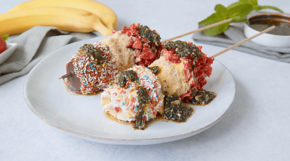 Diesen süßen Spießen kann keiner widerstehen. Wir backen kleine rosa Pancakes und spießen diese abwechselnd mit Erdbeeren und Bananen auf einen Holzspieß auf. Dann tunken wir sie in weiße und dunkle Schokolade und wenden sie in bunten Streuseln, Kekskrümeln und gefriergetrockneten Erdbeeren. Dazu gibt es ein erfrischendes Minzpesto. Süße Spieße sind der Hit!
