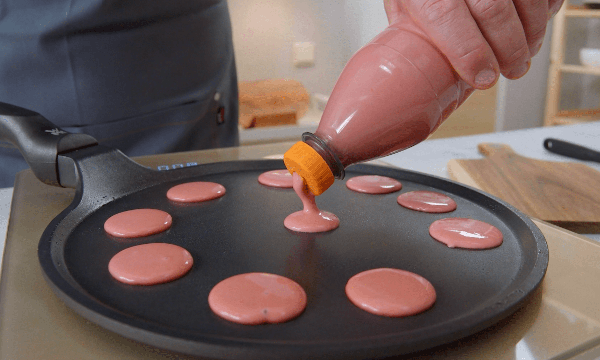 3. Fülle den Teig in die Plastikflasche und drehe den nun mit Loch versehenen Deckel auf die Flasche. Drücke 10 kleine Pfannkuchen aus der Flasche in eine Pfanne und backe die Küchlein von beiden Seiten, bis sie leicht gebräunt sind.