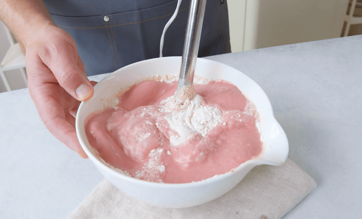 1. Gib Erdbeeren, Eier, Mehl, Zucker, Öl und Milch in eine Schüssel und püriere alles mit einem Stabmixer zu einem glatten Teig.
