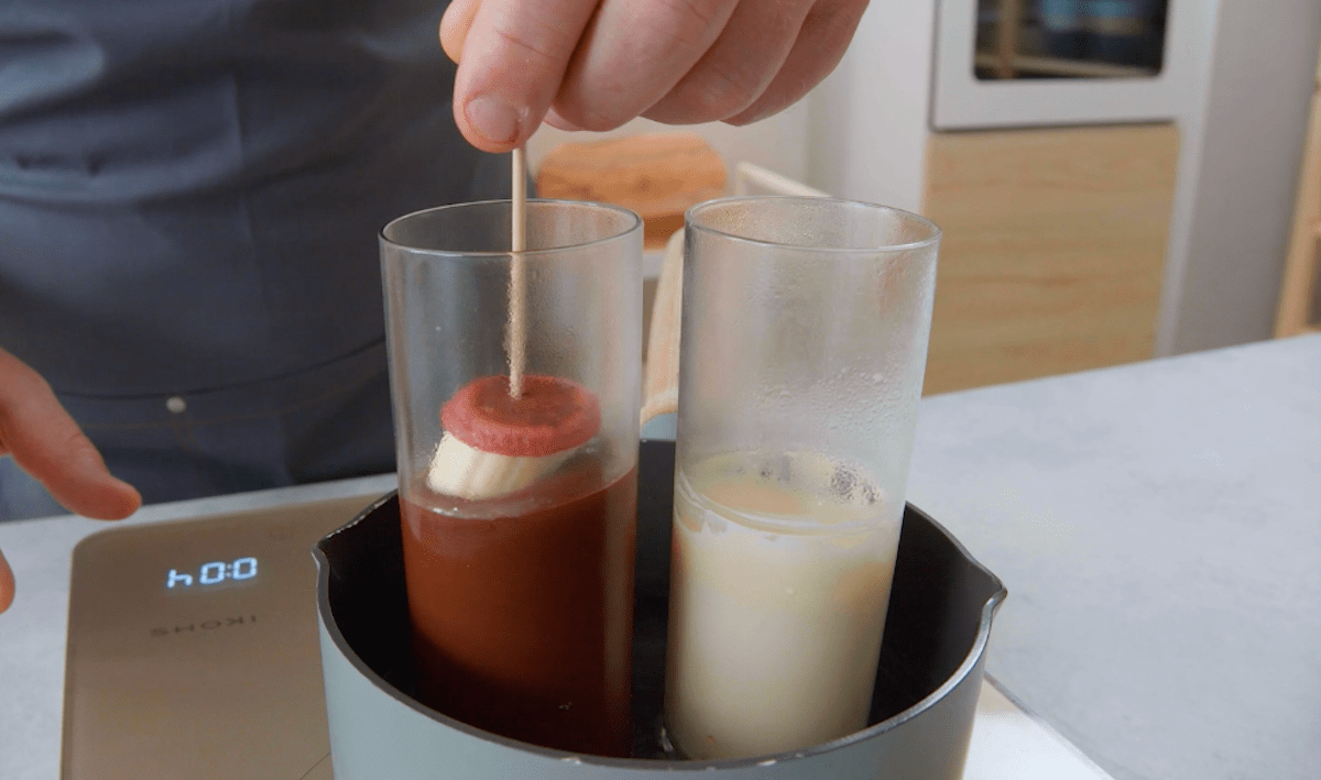 5. Bringe weiße und dunkle Schokolade in je einem Longdrinkglas in einem Wasserbad zum Schmelzen. Tauche dann den einen Spieß in die dunkle und den anderen in die helle geschmolzene Schokolade.
