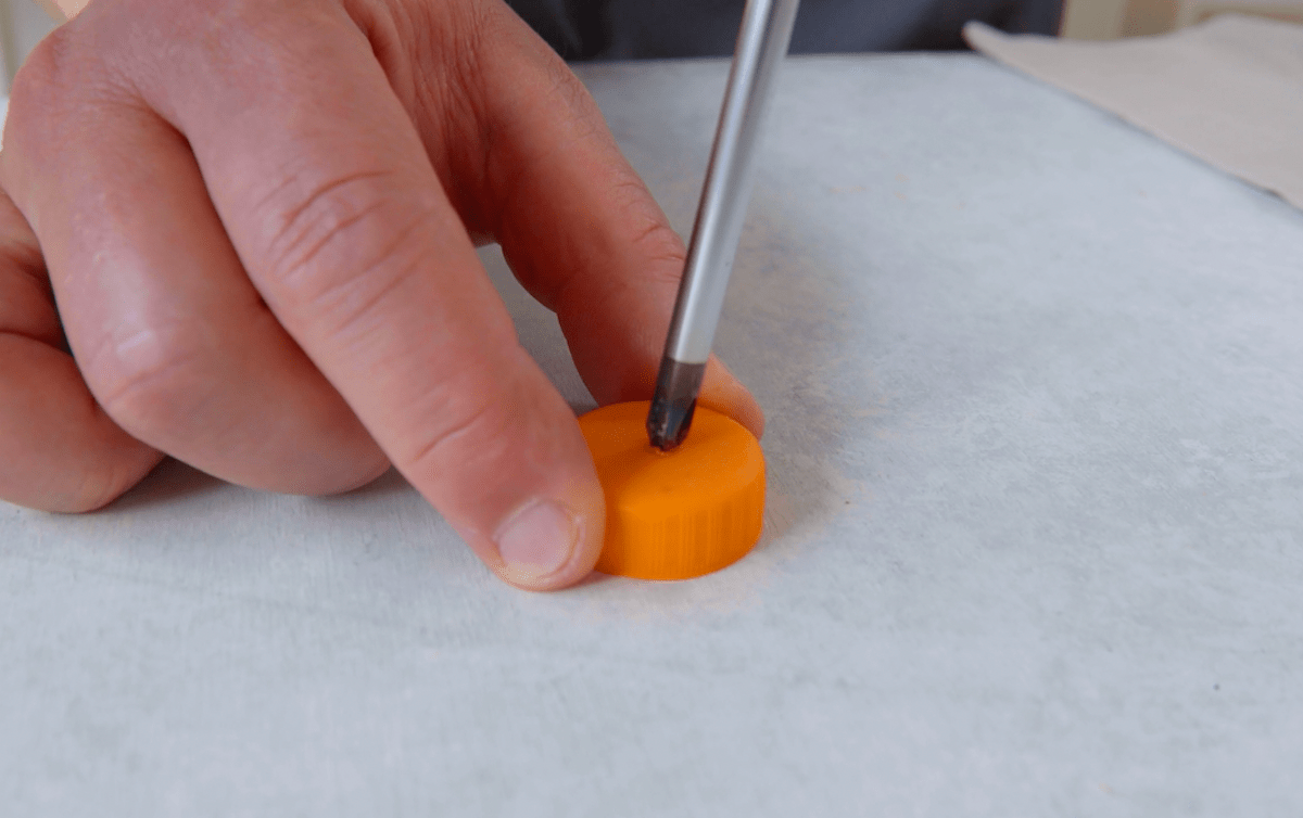 2. Erhitze mit einem Bunsenbrenner einen Schraubenzieher und stich mit diesem ein Loch in den Plastikdeckel einer Plastikflasche.