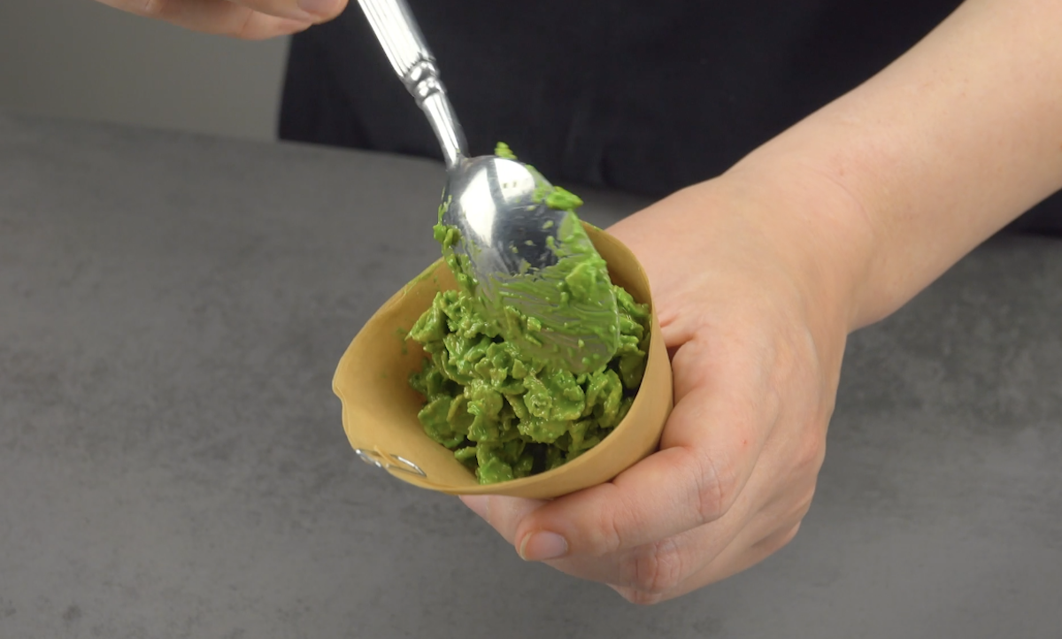 2.4) Fülle die grünen Schoko-Cornflakes mit einem Löffel in die 6 Backpapiertütchen.
