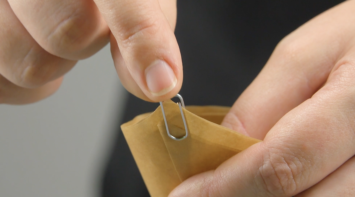 2.1) Als Erstes faltest du kleine Backpapiertüten. Schneide 6 Quadrate à 25 x 25 cm zurecht und falte sie wie beim ersten Rezept in der Mitte, sodass Dreiecke entstehen. Rolle die Dreiecke ein und sichere sie mit einer Büroklammer, damit die Tütchen ihre Form behalten.