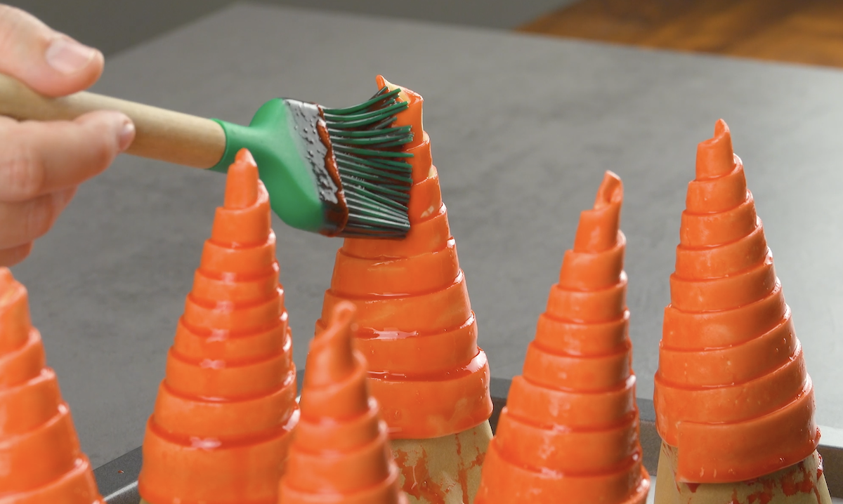 1.5) Verrühre ein Ei mit roter Lebensmittelfarbe und pinsele die Blätterteig-Hütchen damit ein. Schiebe das Blech anschließend für ca. 25 Minuten auf die mittlere Schiene in den Backofen.