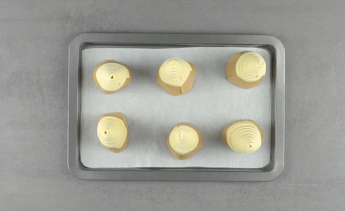 1.4) Stelle die 6 Mützen nun aufrecht auf ein mit Backpapier ausgelegtes Backblech. Wenn die Tütchen nicht stehen wollen, kann man etwas zerknülltes Backpapier hineinstecken.