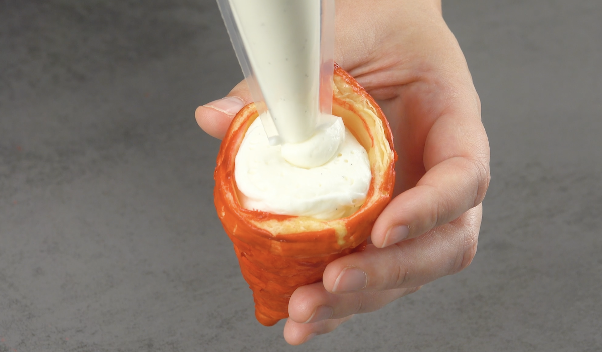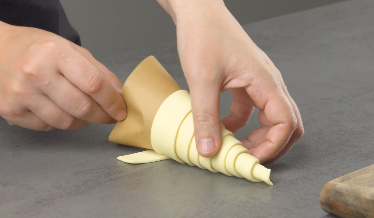 1.3) Wickle nun 2 Streifen Blätterteig um jeweils ein Backpapier-Tütchen. Achte darauf, dass der Teig sich immer leicht überlappt, damit später keine Löcher in der Mütze entstehen.