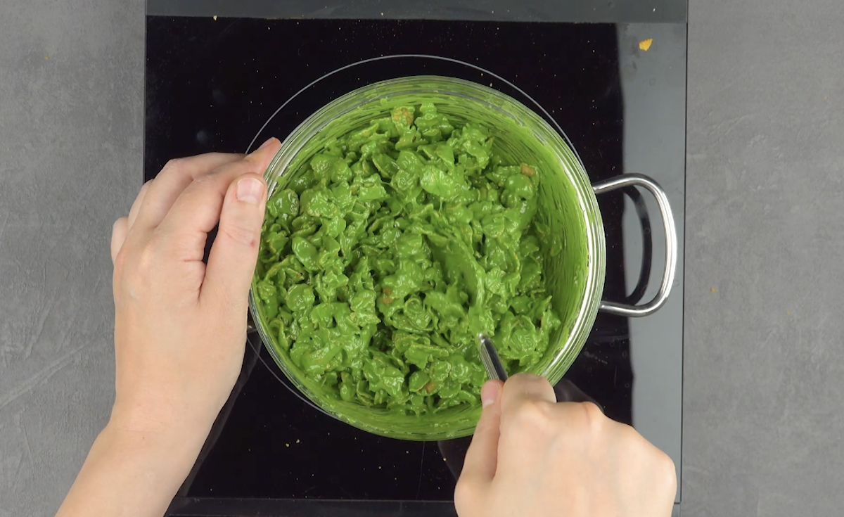2.3) Zerbrösele die Cornflakes leicht per Hand und gib sie in die grüne, geschmolzene Schokolade. Vermische alles gut miteinander.