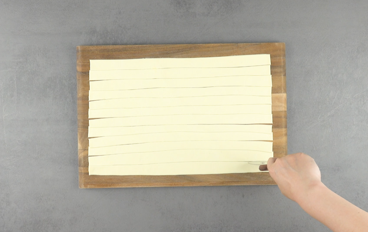 1.2) Rolle den Blätterteig aus und schneide ihn der Länge nach in ca. 2 cm breite Streifen. Insgesamt brauchst du 12 Streifen.
