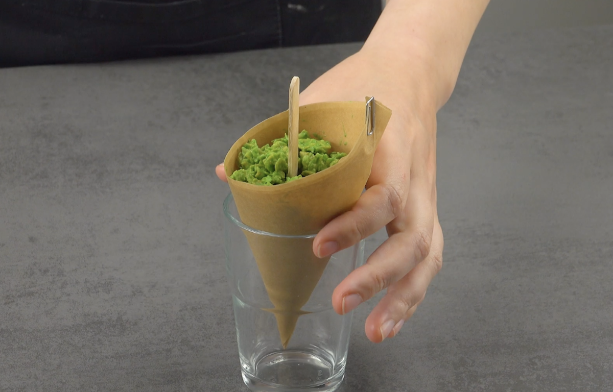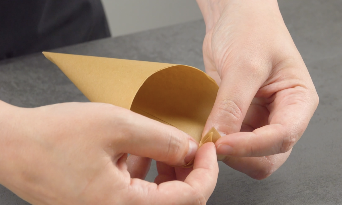 1.1) Falte zunächst aus dem Backpapier kleine Tüten. Schneide das Papier in 6 Quadrate in der Größe 25 x 25 cm. Falte die Quadrate so in der Mitte, dass jeweils ein Dreieck entsteht. Rolle dann das Dreieck zu einer spitzen Tüte. Klappe den offenen Rand leicht nach innen ein und drücke ihn fest, damit die Tüte nicht aufgeht und aufrecht stehen kann. Wiederhole das mit den 5 anderen Tüten. Heize den Backofen schon einmal auf 180 °C Umluft vor.