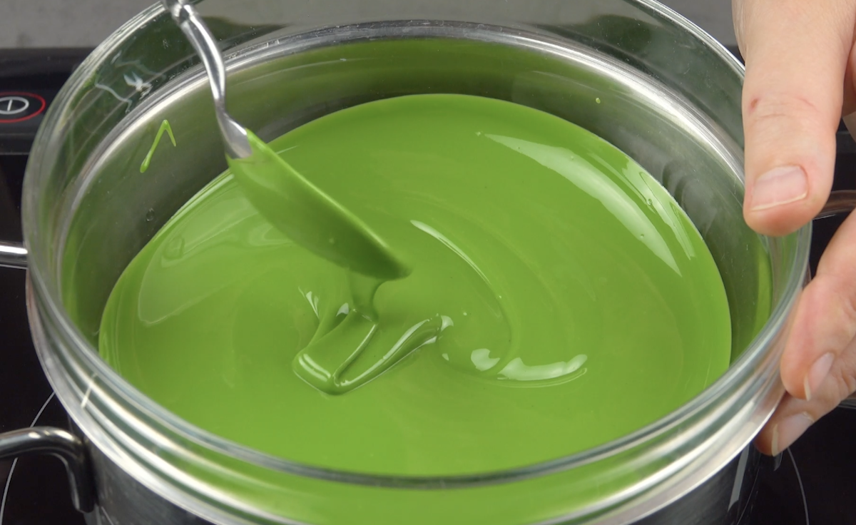 2.2) Schmilz die Kuvertüre über einem Wasserbad. Alternativ dazu kannst du sie auch in der Mikrowelle schmelzen. Verrühre die Kuvertüre mit der grünen Lebensmittelfarbe.