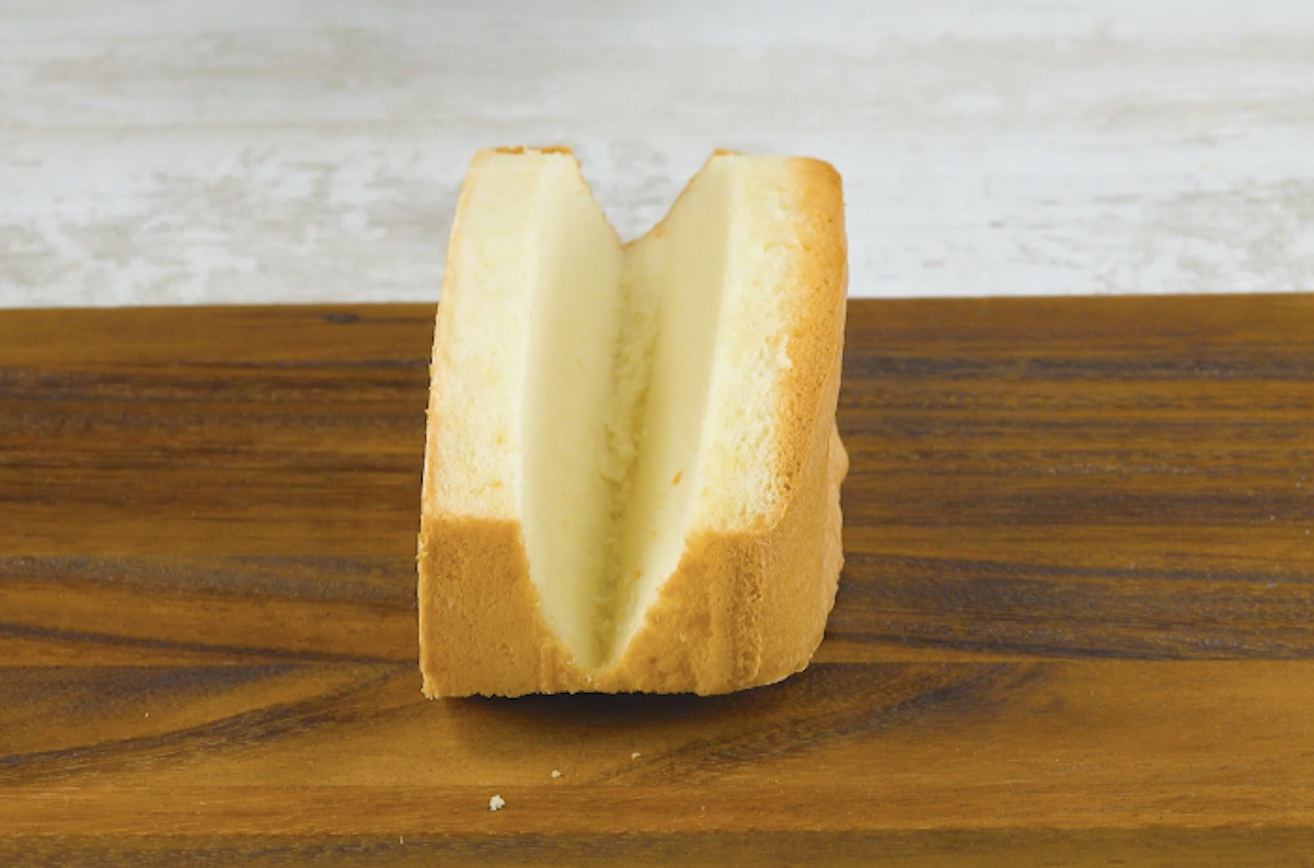 4. Schneide aus dem gebackenem Kuchenteig einen Keil heraus, sodass später eine Banane hineinpasst. Den herausgeschnittenen Keil zerbröselst du und brätst ihn in Butter knusprig an. Mariniere außerdem die Kiwischeiben kurz in Zuckersirup, so werden sie weicher bzw. biegsamer.