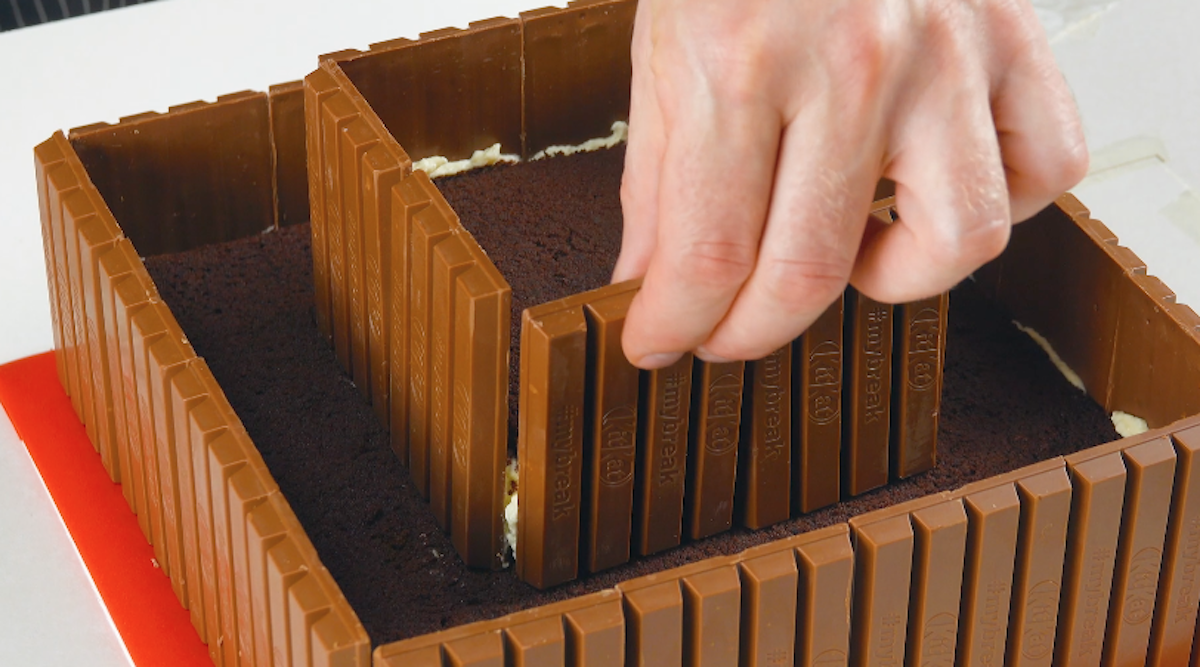 5. Bestreiche die KitKats auf der Rückseite mit der weißen Creme und drücke sie wie einen Zaun ringsherum an beide Kuchen (um den kleinen und den großen Kuchen).
