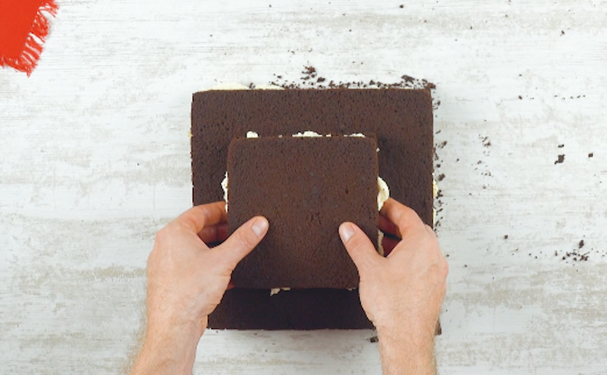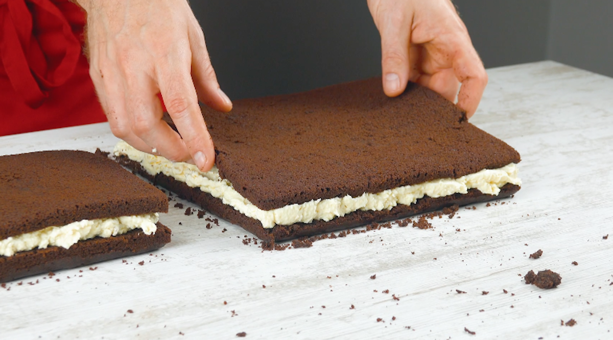 3. Schneide die gebackenen, abgekühlten Kuchen horizontal in der Mitte durch. Bestreiche jeweils ein kleines Viereck und ein großes Viereck mit der Creme. Lege dann jeweils das passende Gegenstück auf die Creme.