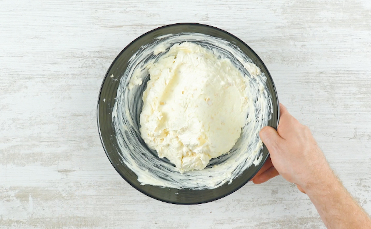 2. Nun wird die Creme zubereitet. Zerdrücke die Raffaellos mit einer Gabel und gib Frischkäse und Vanillearoma hinzu. Schlage alles cremig auf und kühle das Ganze, solange der Kuchen noch im Ofen ist.