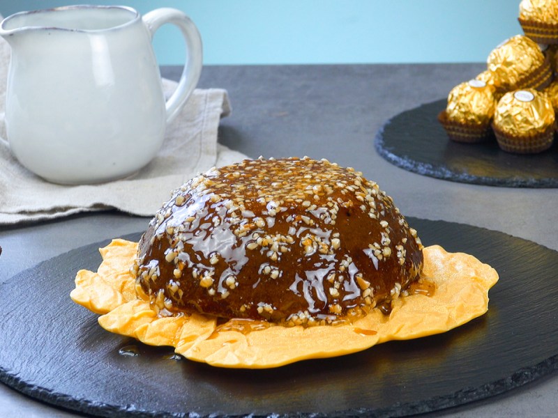 Leopardenkuchen mit Schokoglasur und Haselnusskrokant