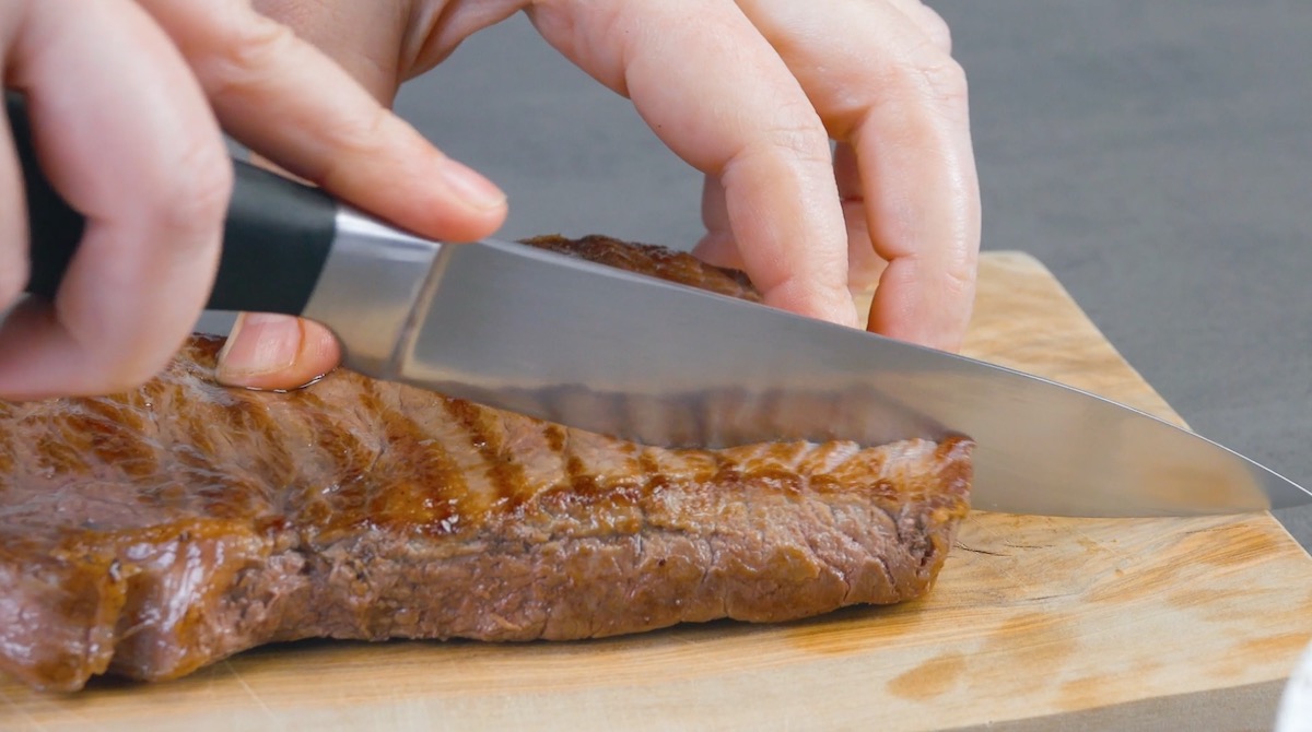 3. Salze das Rumpsteak und brate es kurz von beiden Seiten scharf in Öl an. Schiebe das Rumpsteak anschließend bei 140 °C Umluft in den Ofen, bis die gewünschte Garstufe erreicht ist. Kontrolliere diese mit einem Fleischthermometer. Lass das Fleisch anschließend kurz in Alufolie ruhen und schneide es danach in vier gleich breite Streifen.