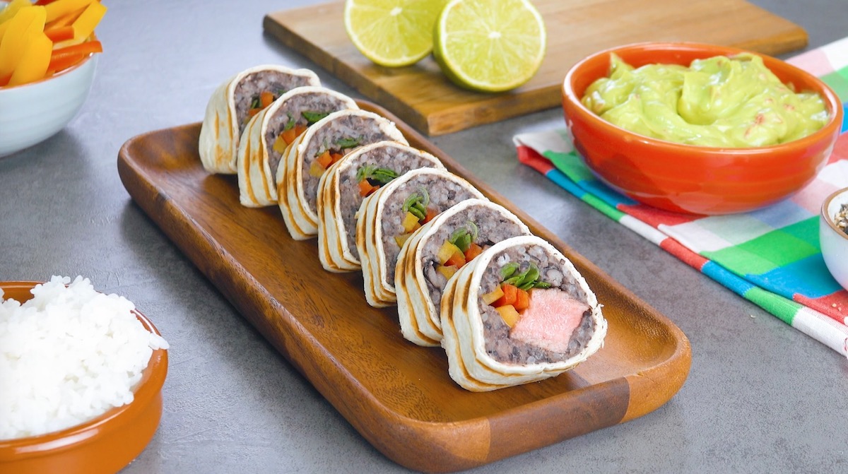 Am besten schmeckt dieses selbstgemachte Sushi aus Tortillawraps, Bohnenmus und Rumpsteak übrigens mit Guacamole.