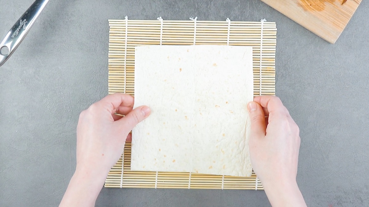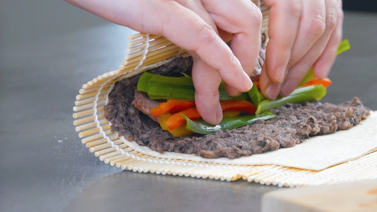 5. Lege die Tortillawraps nacheinander auf eine Sushimatte. Befeuchte jeden Wrap zunächst mit etwas Wasser und bedecke ihn dann mit Bohnenmus; lass an einer Seite einen Rand frei, um den Tortillawrap später besser aufrollen zu können. Belege das Bohnenmus dann mit einem Streifen Rumpsteak sowie mit Paprika- und Frühlingslauchstreifen. Rolle den Tortillawrap dann auf.