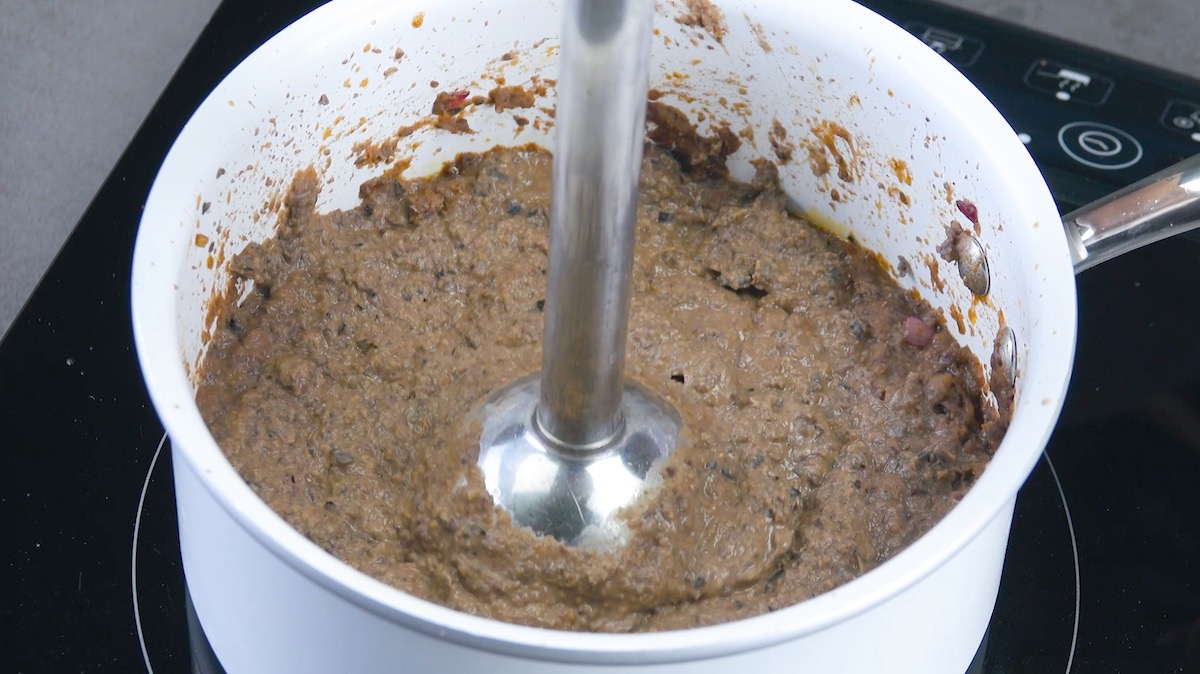 1. Erhitze für das Bohnenmus Öl in der Pfanne und schwitze darin Zwiebeln und Knoblauch glasig an. Gib die restlichen Zutaten hinzu, lass alles kurz köcheln und püriere es dann zu einem Mus.
