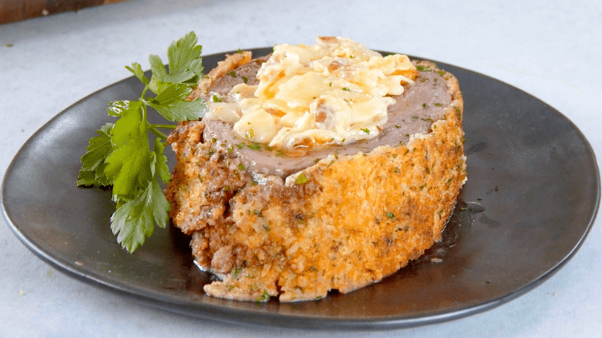 11. Brate den nun panierten Tafelspitz von allen Seiten in Öl an und schiebe ihn dann für 80 Minuten bei 180 °C Ober-/Unterhitze in den Ofen. Lass den mit Kartoffelgratin gefüllten Tafelspitz vor dem Servieren für 20 Minuten ruhen. Achte beim Anschneiden darauf, das Fleisch gegen die Faser anzuschneiden.
