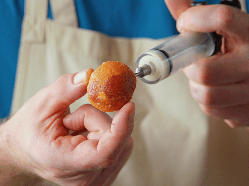 Gefüllte Knusperbälle mit weißer Schokocreme und Himbeermarmelade