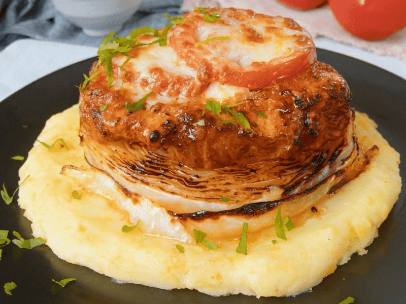 Schweinenacken-Weißkohl-Türmchen auf Stampfkartoffeln