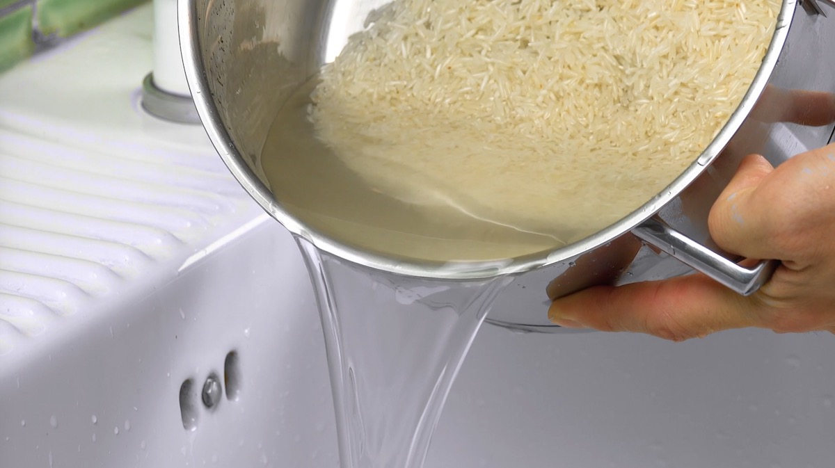 Nachdem nun das Grundlegende geklärt ist, kann es losgehen. Wir zeigen dir, wie man Schritt für Schritt den perfekten Reis zubereitet: 1.) Als Erstes sollte der Reis mit kaltem Wasser gewaschen werden. Warum? Um überschüssige Stärke zu entfernen. Du kannst dazu ein Sieb benutzen oder, falls du keines hast: Gib Wasser und Reis einfach in einen Topf und gieße das Wasser vorsichtig wieder ab. Wiederhole das so lange, bis das Wasser klar ist.