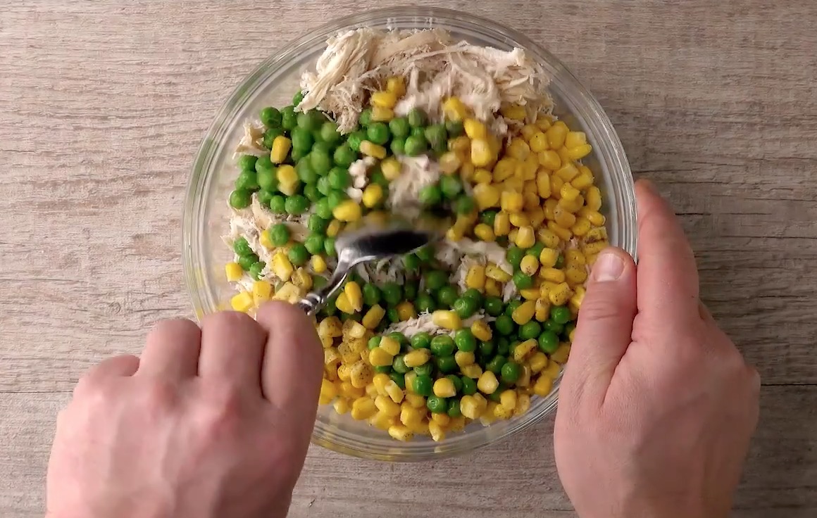 Fülle die Stückchen dann in eine große Schüssel, gib Mais, Erbsen und nach Belieben Salz und Pfeffer hinzu. Mische danach alles gut durch.
