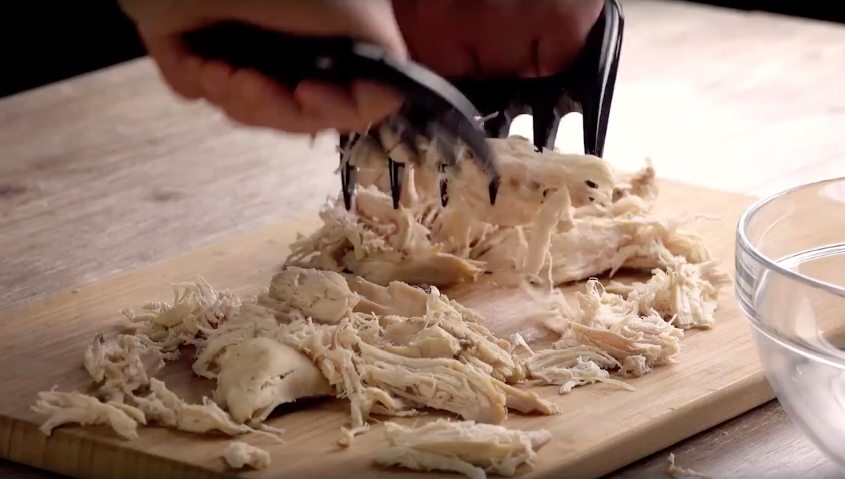 Zerkleinere zuerst die zwei Hähnchenbrüste auf einem Schneidbrett. Das geht am besten mit so genannten Fleischkrallen.