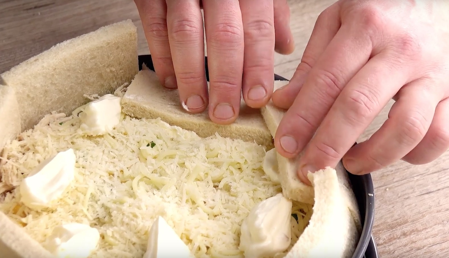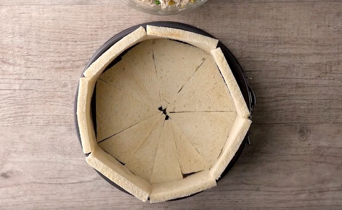 Klappe die Toastscheiben anschließend sorgfältig nach innen. Der Frischkäse sollte dabei helfen, dass sie besser auf der Tortenoberseite haften bleiben.