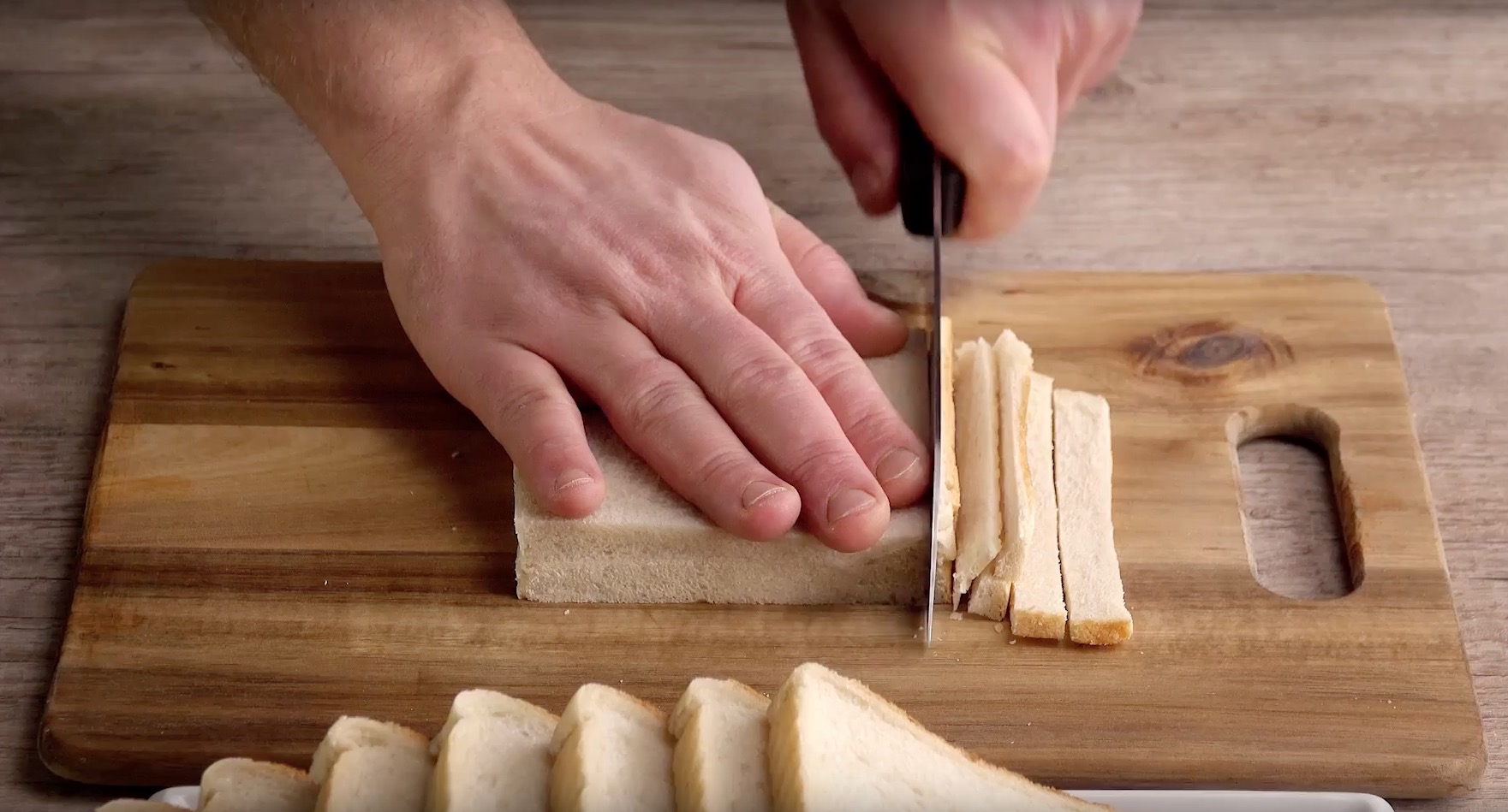 Fette dann eine Springform mit dem Öl ein. Optimal für die oben genannten Mengenangaben ist eine Form mit einem Durchmesser von 24 cm. Schneide anschließend die Ränder aller Toastscheiben ab. Das geht schneller, wenn du immer zwei übereinanderlegst.