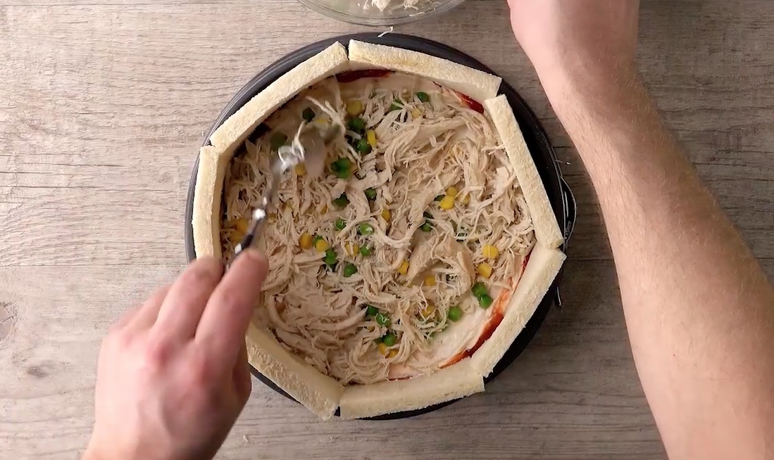 Wiederhole diese Schritte, indem du noch einmal Toastbrot, Ketchup, Frischkäse und Hühnchenmischung aufeinanderschichtest. Behalte vom Frischkäse allerdings etwa 7 EL zurück.