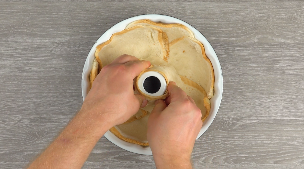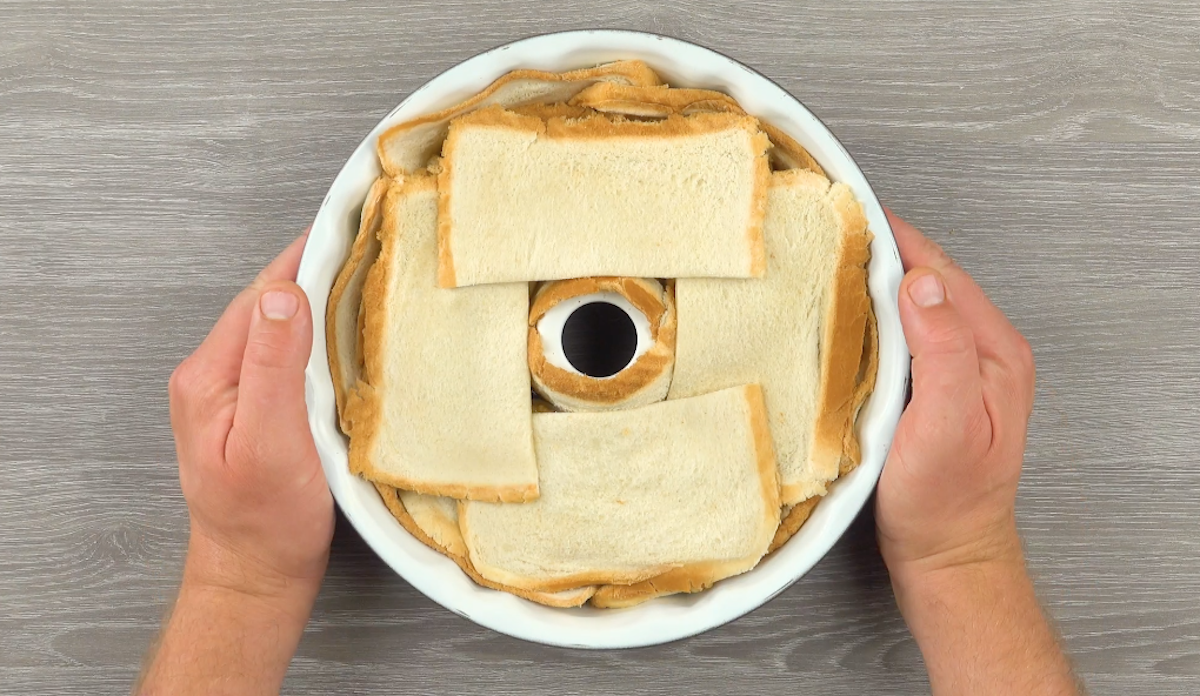 1.2) Plätte mit einem Nudelholz die Toastscheiben und halbiere 5 von ihnen. Lege die 6 übrigen, ganzen Scheiben in eine Gugelhupfform an die Außenwände und 2 halbe Scheiben um den Innenring.