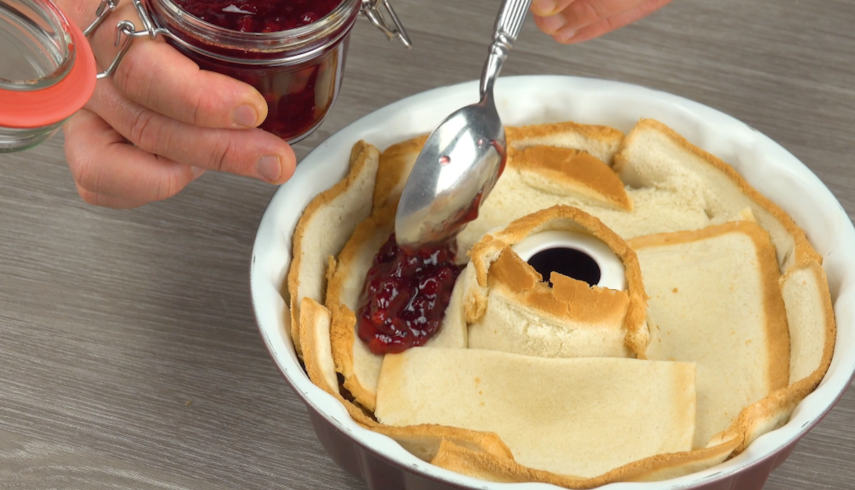 2.4) Dann kommen wieder eine Schicht Toastbrot und anschließend eine Schicht Preiselbeermarmelade in die Form.