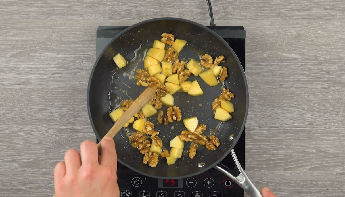 2.2) Karamellisiere die Apfelstücke und die Walnüsse in einer Pfanne. Lasse sie danach etwas abkühlen.