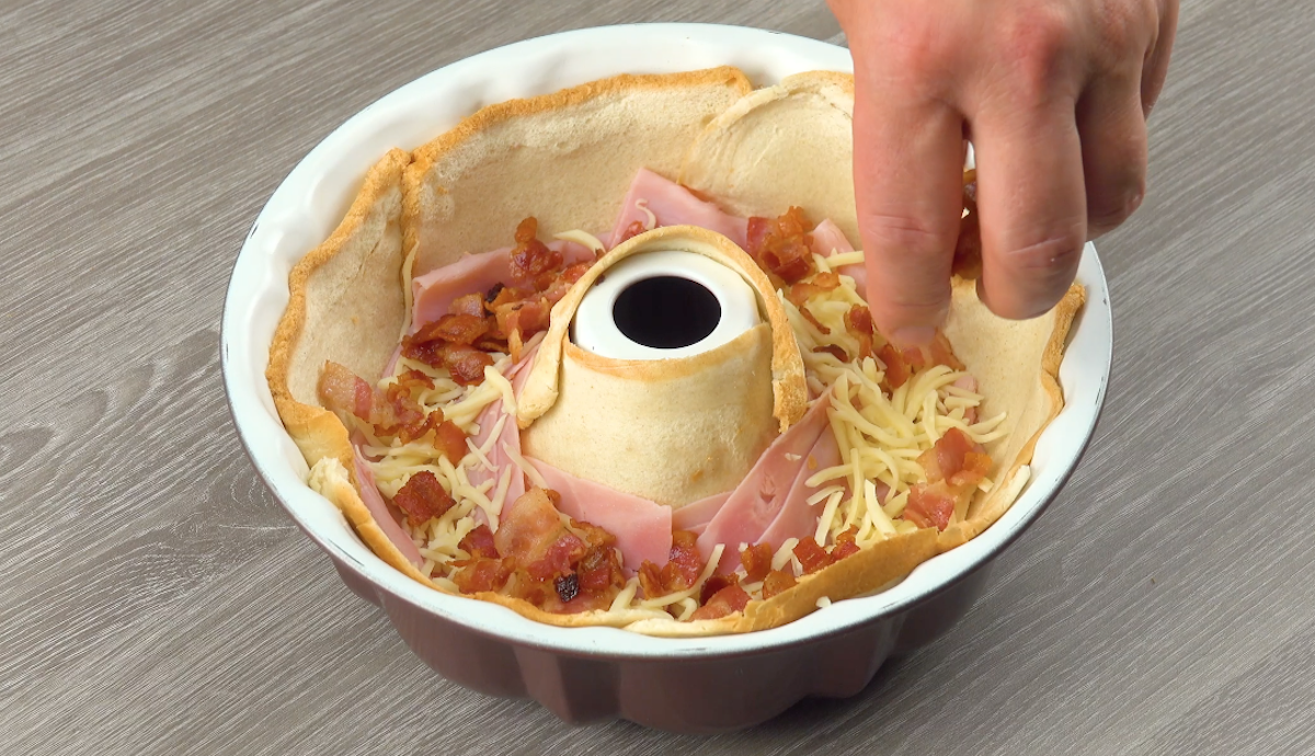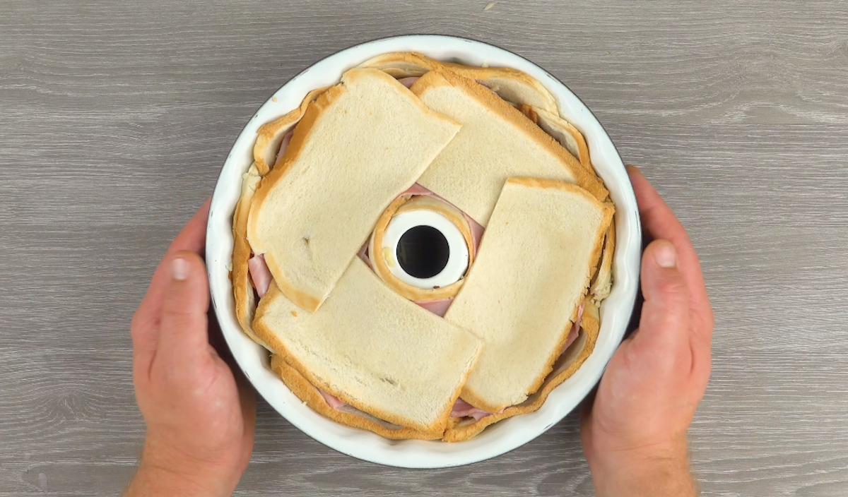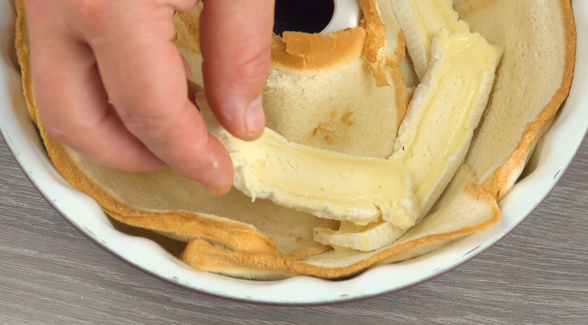 2.1) Plätte die Toastscheiben mit einem Nudelholz und lege die Kuchenform mit 6 ganzen Scheiben an der Außenwand und 2 halben am Innenring aus. Lege dann 5 Scheiben Camembert darauf.