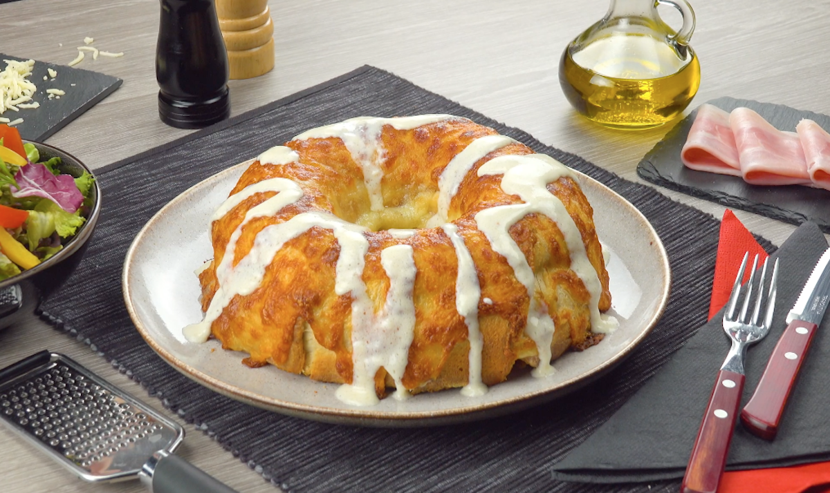 1.6.) Stürze mit Hilfe eines mit Backpapier ausgelegten Backbleches die Kuchenform. Gieße etwas von der Béchamelsoße aus Schritt 1.1 über den Toast-Ring und streue noch etwas Mozzarella darüber. Schiebe das Blech nochmals für 10 Minuten in den Ofen, bis der Käse geschmolzen und der Toast-Ring schön braun ist.